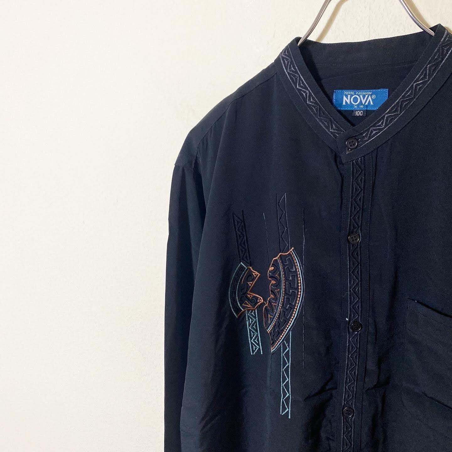 Vintage 刺繍 ノーカラーシャツ 長袖 シャツ 古着 ヴィンテージ