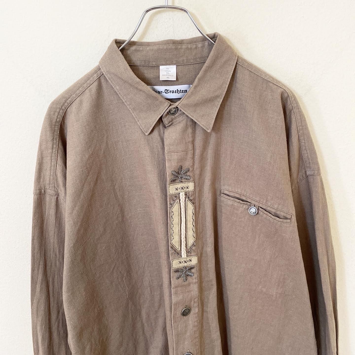 ブラウンのボディとチロリアンシャツ特有のボタンや刺繍のデザインが非常に良い雰囲気の1着です。