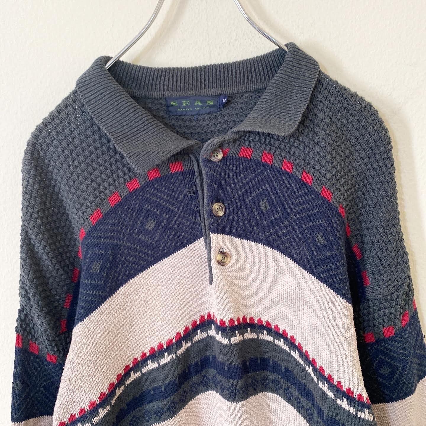 90s Vintage 襟付き ハーフボタン ニット 総柄 古着 ヴィンテージ