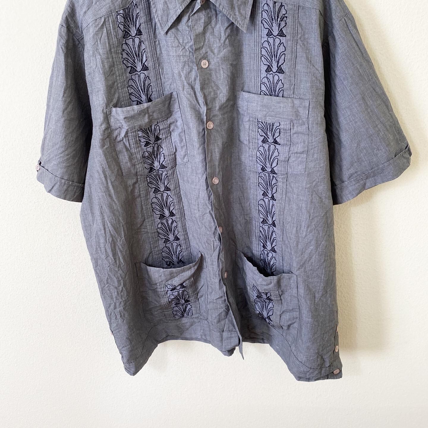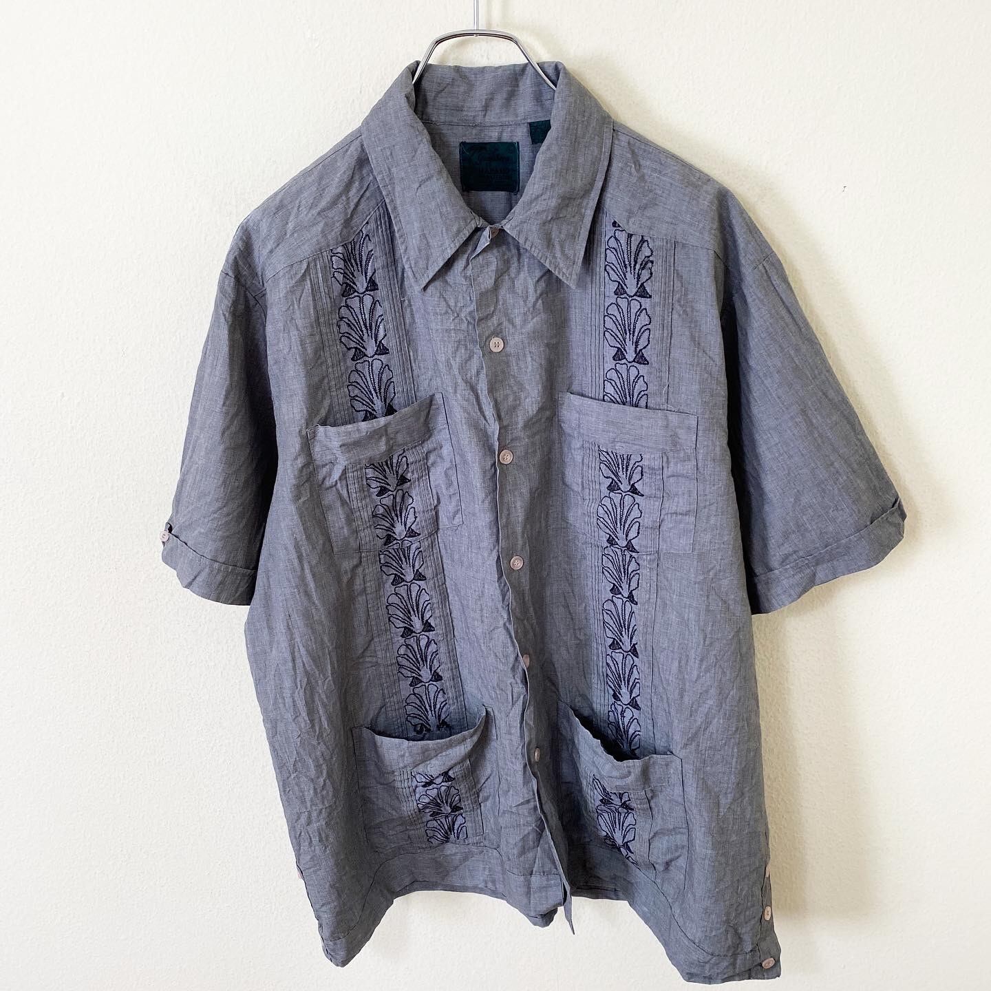 ブラックに後染めされたボディの風合いとキューバシャツ特有の刺繍、ポケットのデザインがたまらなく良い雰囲気の1着です。