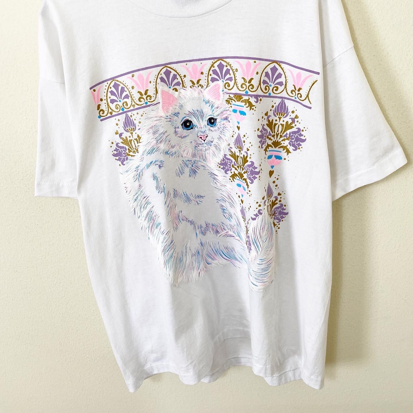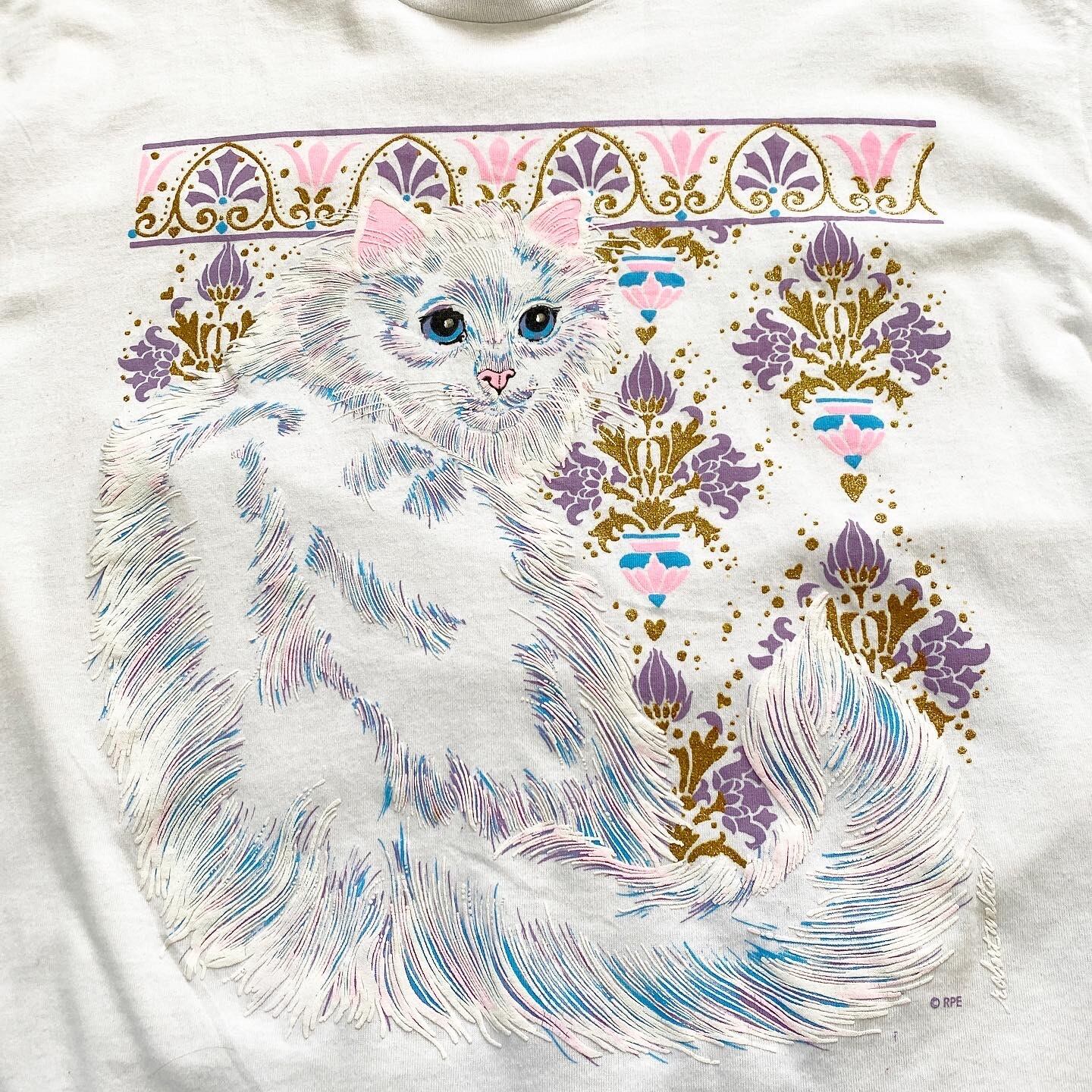 ホワイトのボディに描かれた猫のデザインがとても可愛い1着です。