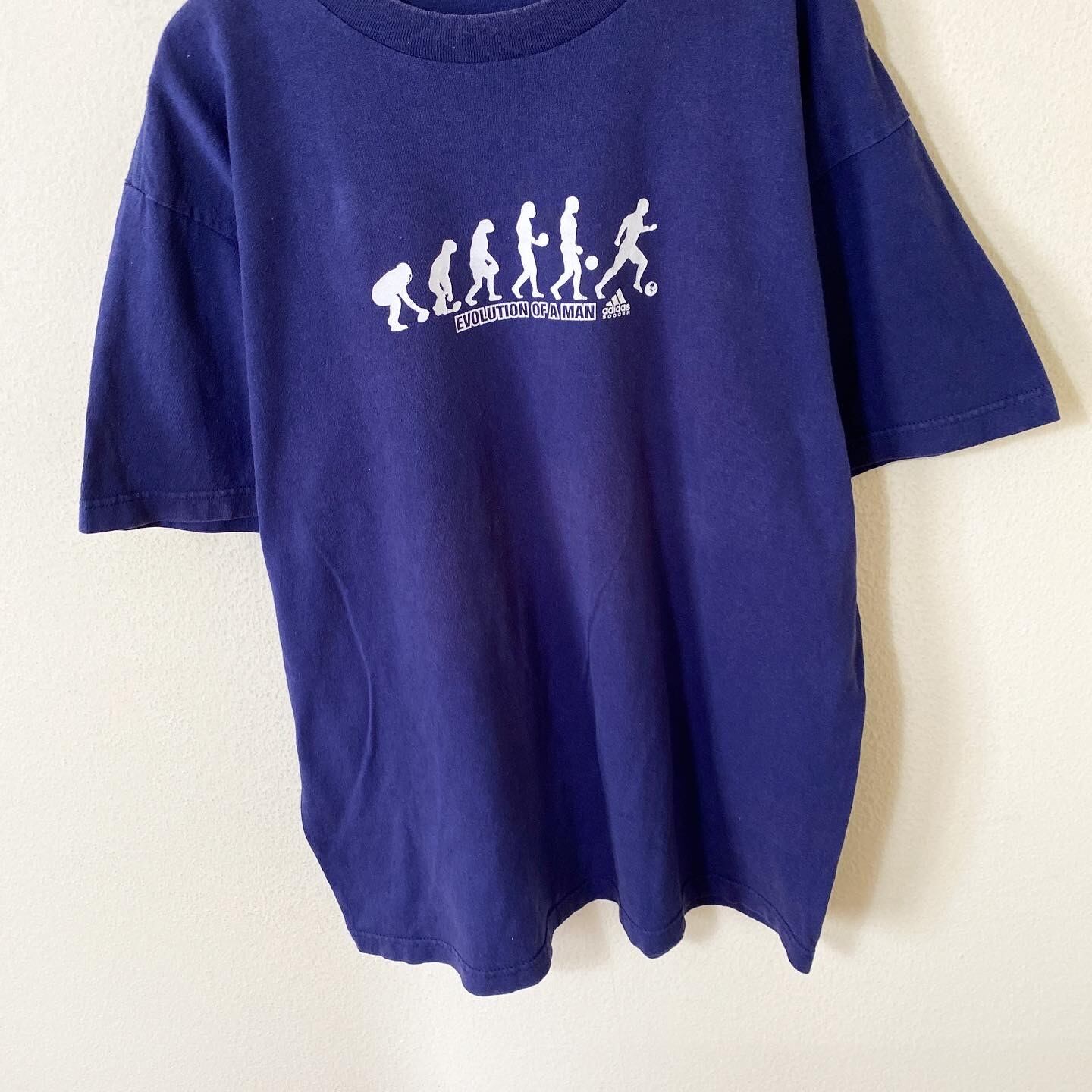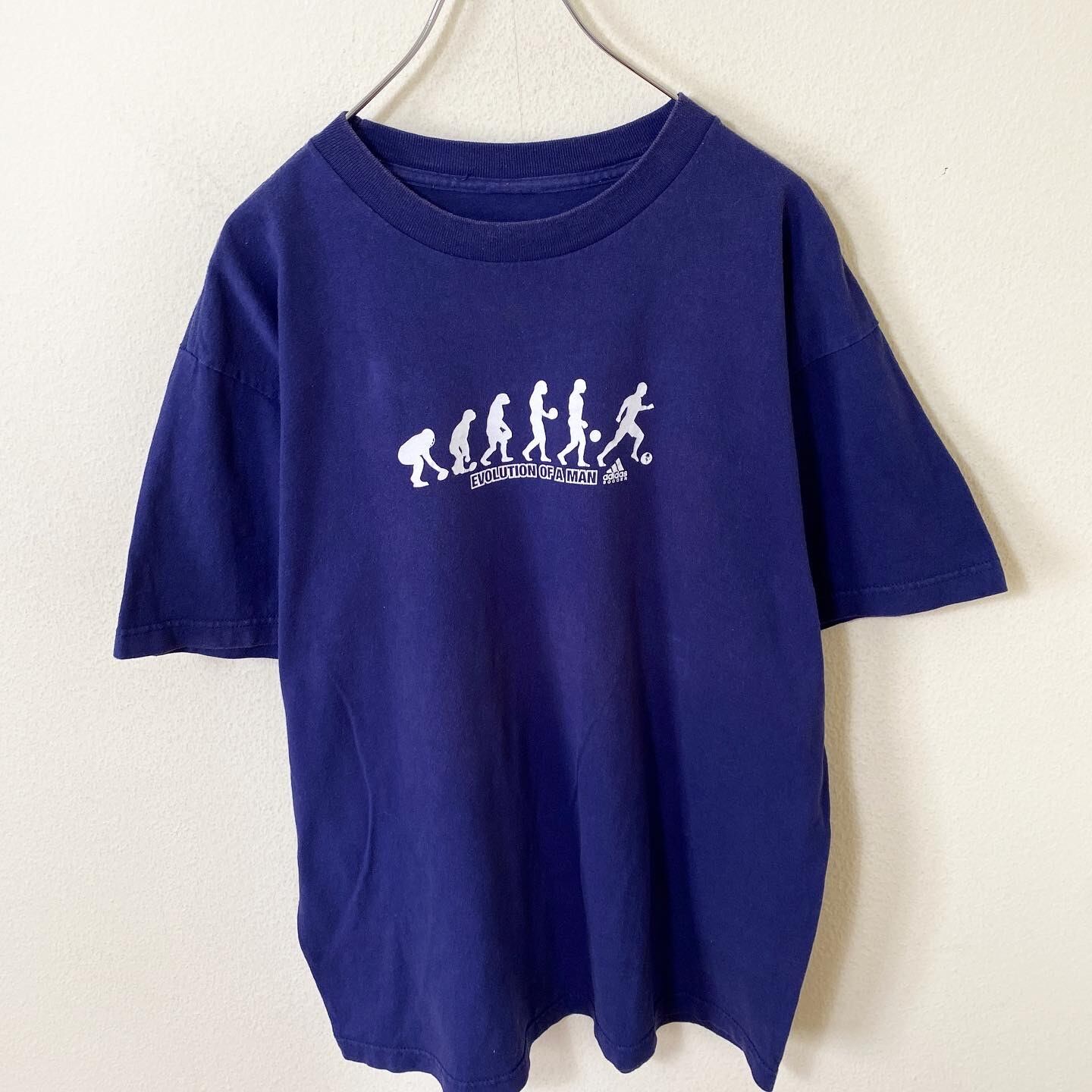 フロントに描かれた人類の進化とサッカーを絡めたプリントデザインの風合いがたまらなく良い雰囲気の1着です。