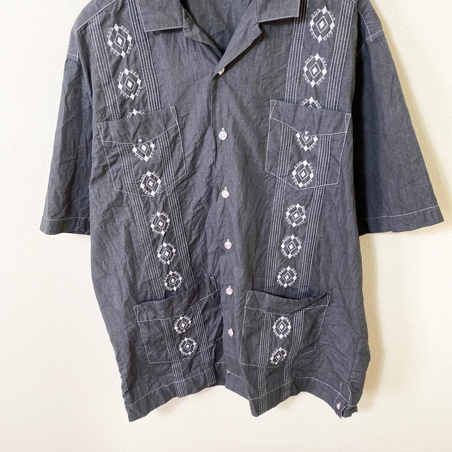ブラックに後染めされたボディの色合いとキューバシャツ特有のポケット、刺繍の風合いがたまらなく良い雰囲気の1着です。