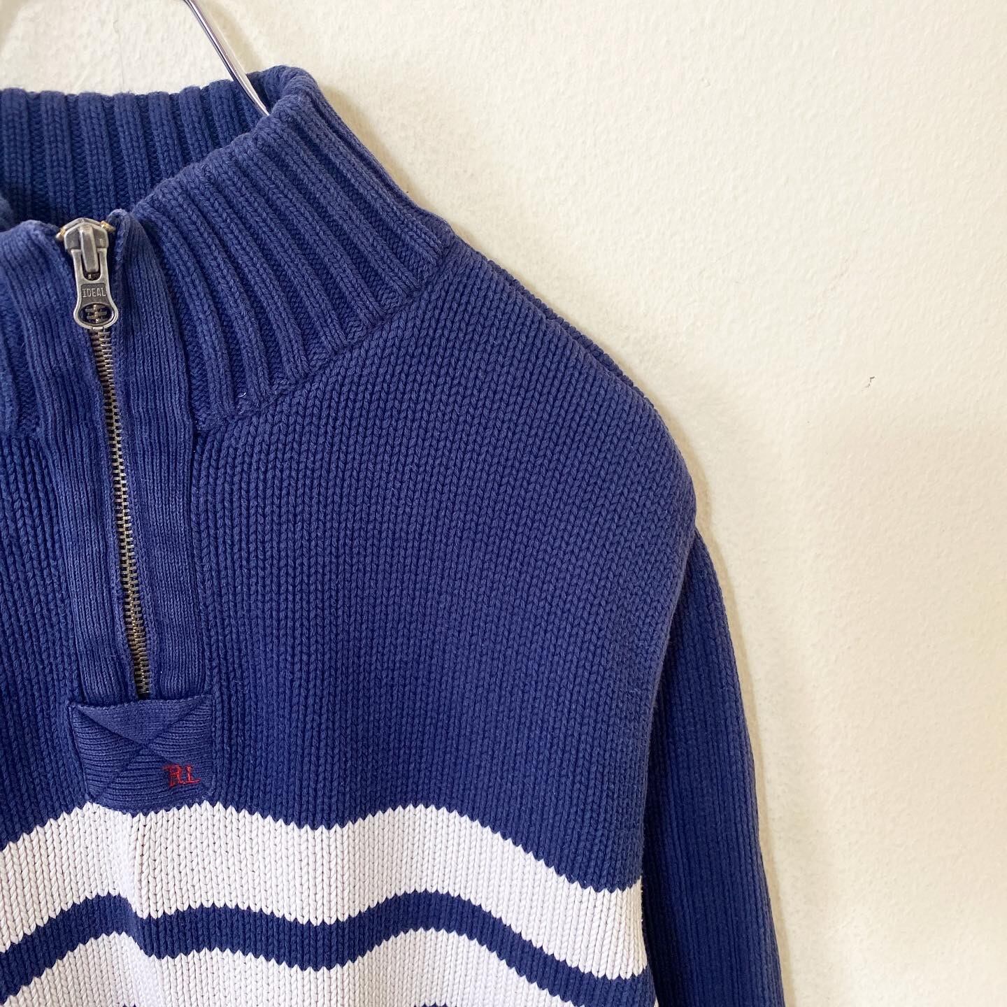 ネイビーのボディとさりげなく施されたボーダー、RLの刺繍ロゴの風合いがとても良い雰囲気の1着です。