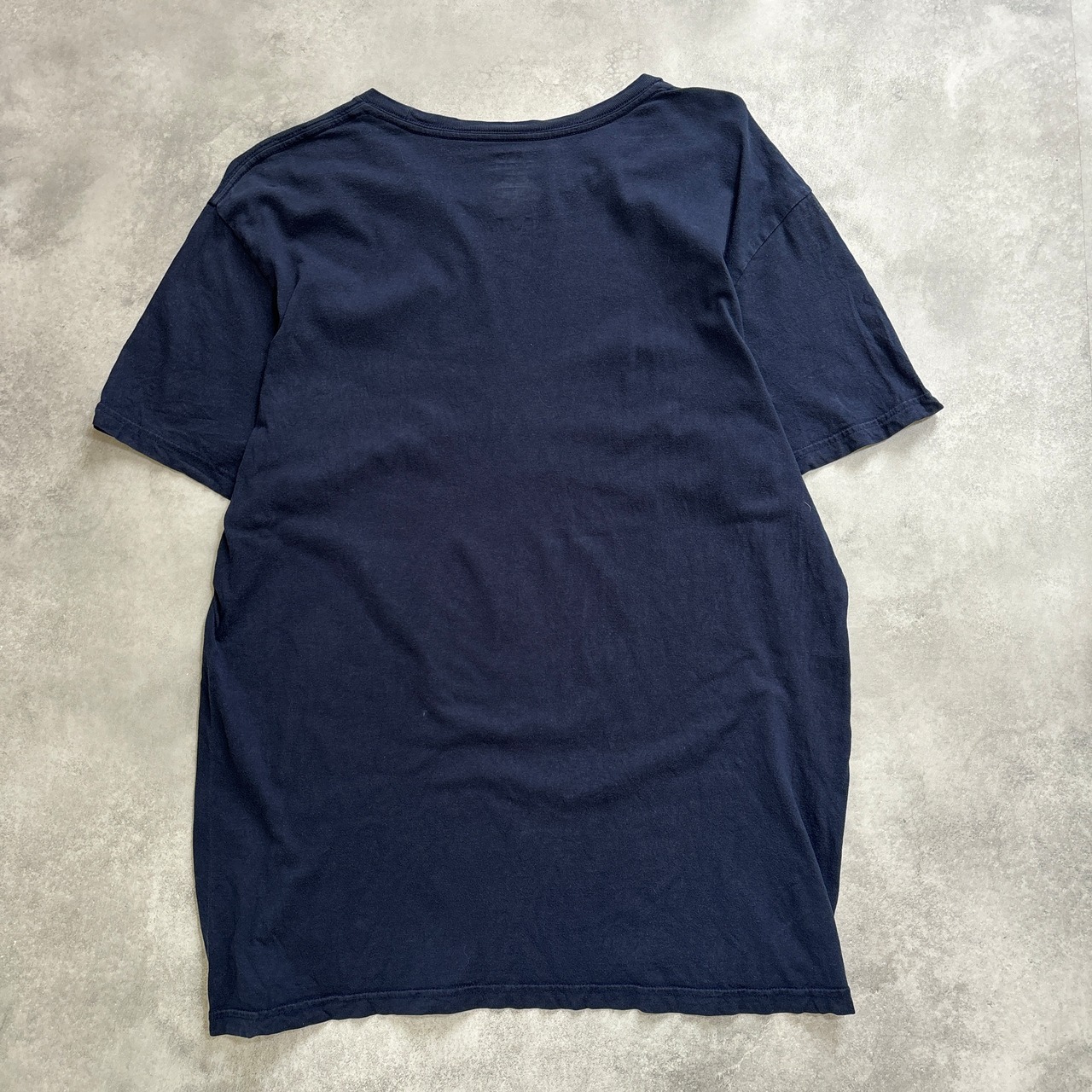 ネイビーのボディと定番の胸元ではなく裾に入ったイエローのワンポイント刺繍ロゴの風合いがとても良い雰囲気の1着です。
