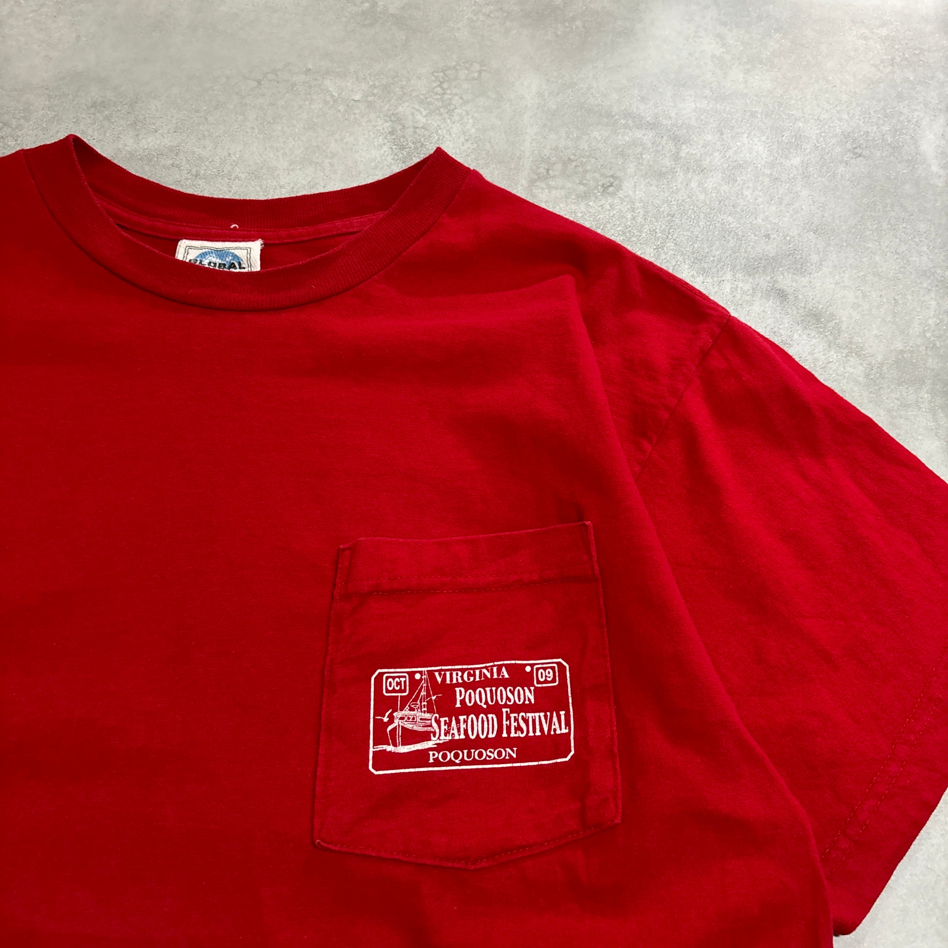 パッと目を惹く赤色のボディと胸元のポケット、バックプリントのデザインがとても良い雰囲気の1着です。
